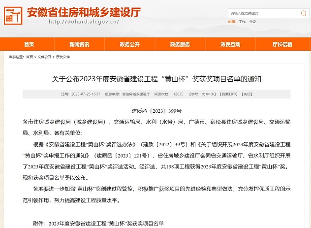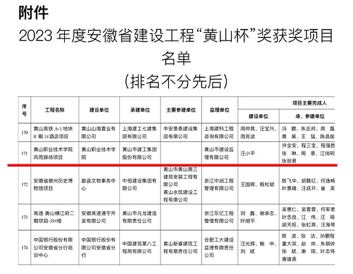 7月25日,省住建廳公布2023年度安徽省建設工程“黃山杯”獎獲獎項目名單,黃山建工承建的黃山職業(yè)技術學院風雨操場項目工程位列榜單、喜獲殊榮。
