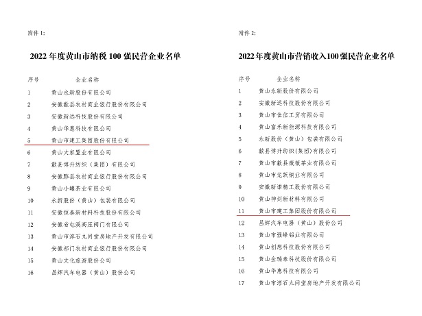 日前,由黃山市工商聯(lián)、市經(jīng)信局、市監(jiān)管局及市商務(wù)局聯(lián)合發(fā)布2022年度黃山市民營企業(yè)納稅及營銷收入百強名單公布,黃山建工集團連續(xù)多年再次實力入圍,獲此殊榮!