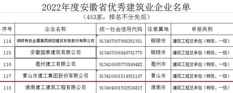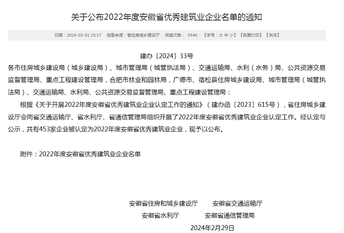 近日,安徽省住房和城鄉(xiāng)建設(shè)廳發(fā)布了“2022年度安徽省優(yōu)秀建筑業(yè)企業(yè)”名單,黃山建工集團憑借企業(yè)經(jīng)營發(fā)展、管理創(chuàng)新能力、企業(yè)建造能力、企業(yè)文化建設(shè)、社會責(zé)任履行等方面的卓越表現(xiàn)再次名列榜單――建筑工程總承包類(特級、一級類別)省優(yōu)秀建筑業(yè)企業(yè),連續(xù)多年斬獲該項殊榮。