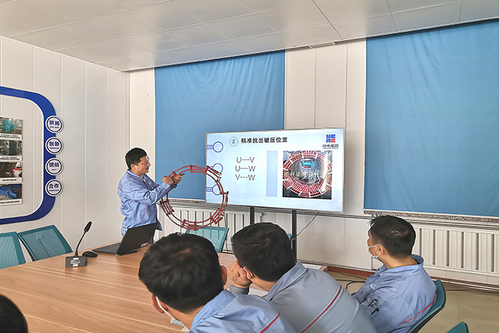佳電股份高級(jí)技師、電工車間接線工成明坤以實(shí)際案例向職工詳細(xì)講解了繞組接線的重要性以及常規(guī)三相接線圓圖的繪制,通過(guò)自己制作的接線線路實(shí)物,詳細(xì)地向大家分享了快速尋找破壓點(diǎn)的小竅門,僅需要一個(gè)萬(wàn)用表和一把斷線剪,通過(guò)分相→分組→分頭就能快速找到故障位置。