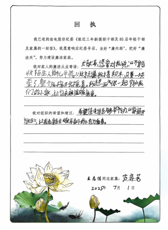 佳電股份將廉潔教育觸角延伸至“家庭”陣地,向近三年新提職干部、85后年輕干部及其家屬同步發(fā)放《家庭助廉倡議書》與《給年輕干部提個醒》廉潔讀本。倡議書中既有黨紀(jì)法規(guī)解讀,又含溫情寄語,旨在以家庭“小港灣”筑牢企業(yè)“大防線”。活動中,黨員干部與家屬共同研讀、深刻感悟,家屬們紛紛回信,字里行間滿是“廉潔齊家”的囑托與“慎終如始”的期許,讓清廉家風(fēng)在企業(yè)中傳遞。